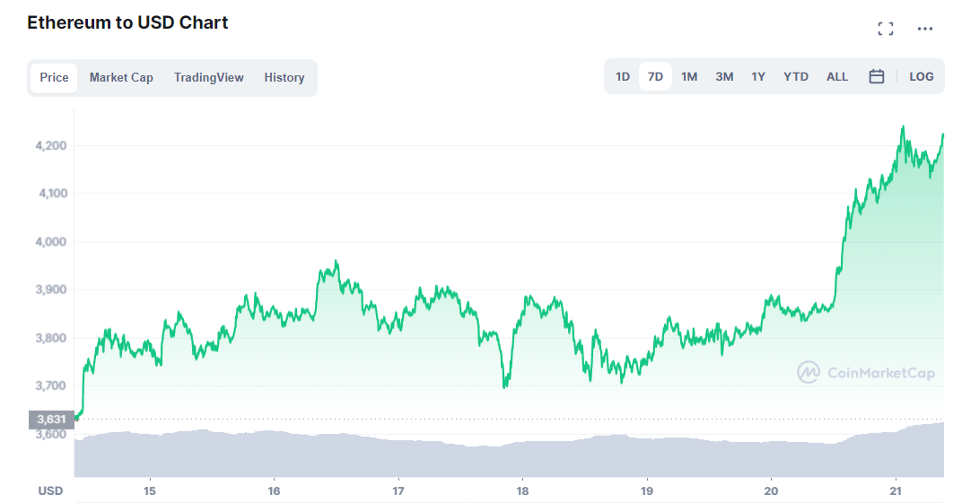 Lors de la rédaction de cet article, l’Ether s’échangeait à 4 221 dollars, en hausse de 9,42% sur les 24 dernières heures :